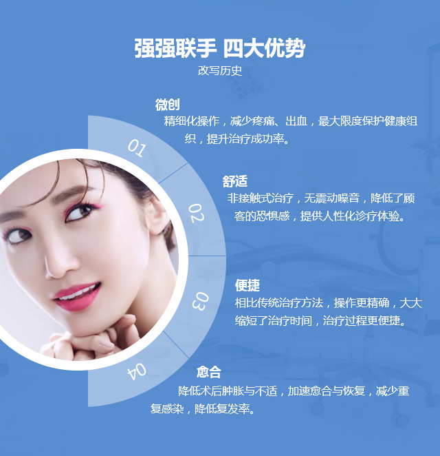 目前为止侵入性较低的激光美白疗法,牙齿美白效果更明显,时间较短,仅需半小时,酸痛敏感不明显。镭射美学还可以针对牙龈修整、笑线调整、